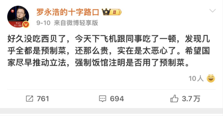 他正在博文中明白暗示,西贝几乎是预制菜,却并没有标注出能否利用预制菜的标识,同时其价钱也是居高不下。简单的三行话,却引来了不止三天的论和。正在这条微博发布后的几小时内,相关话题#罗永浩吐槽西贝预制菜# #西贝预制菜成本争议#就敏捷登上了微博热搜榜位,惹起了大范畴的收集会商。